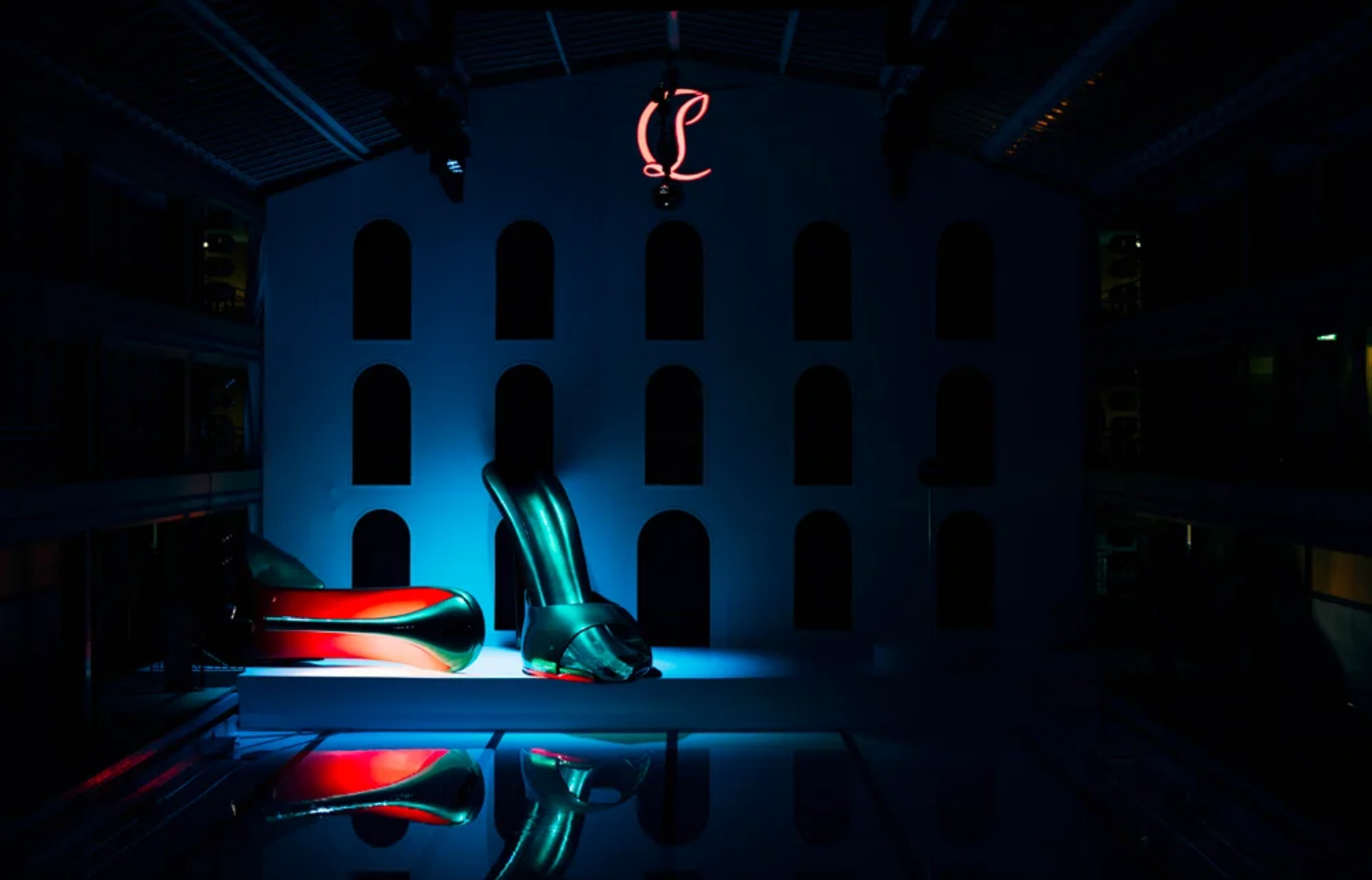 Pour ajouter une touche ludique, une paire de souliers XXL, conçue pour l’occasion, a servi de toboggan, permettant à Christian Louboutin, David LaChapelle et LP de glisser joyeusement dans le bassin, soulignant l’aspect immersif et interactif de ce show.